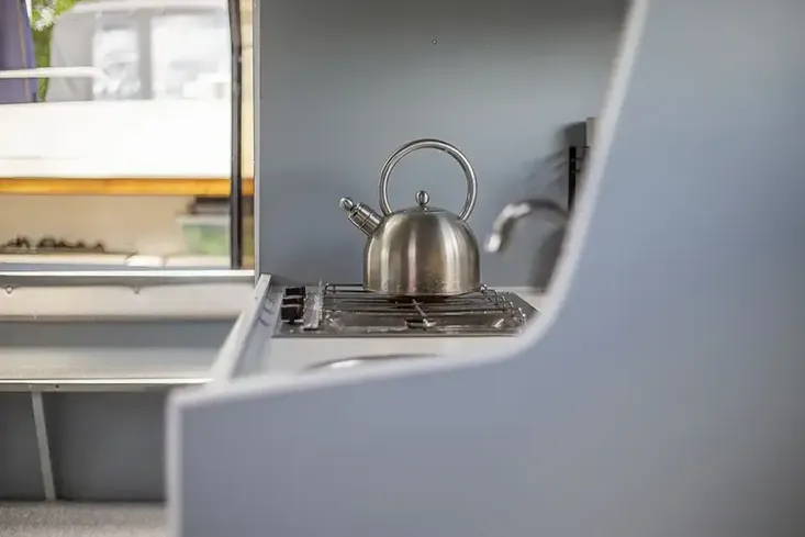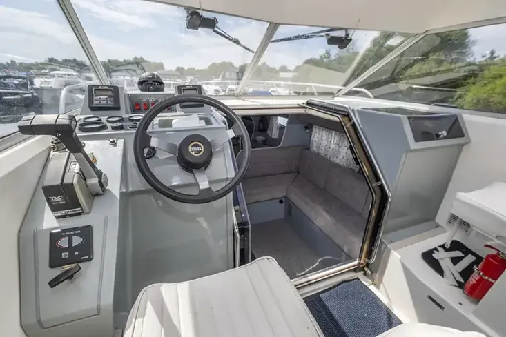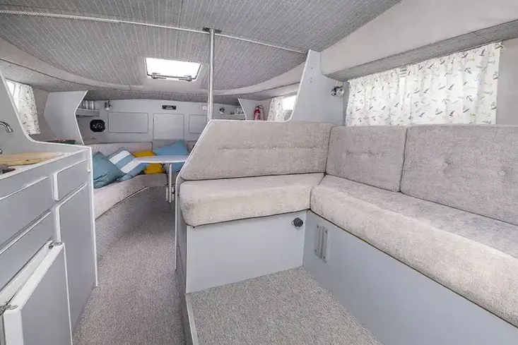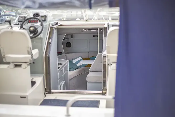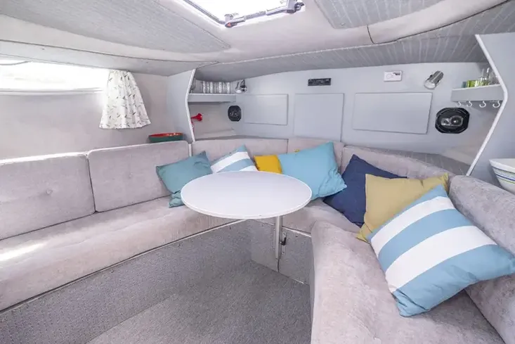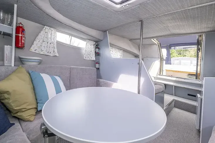 A wide sliding double door gives access to the interior, which feels spacious, and is well-presented with tasteful grey carpeting and upholstery which is in good condition. Panoramic windows give a light, airy feel, and there is a comfortable seating area in the forward saloon that converts into a double berth.