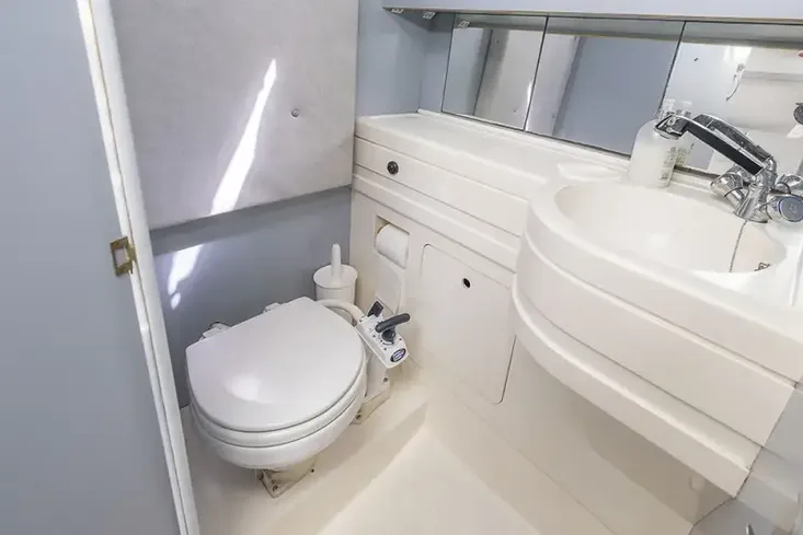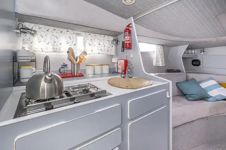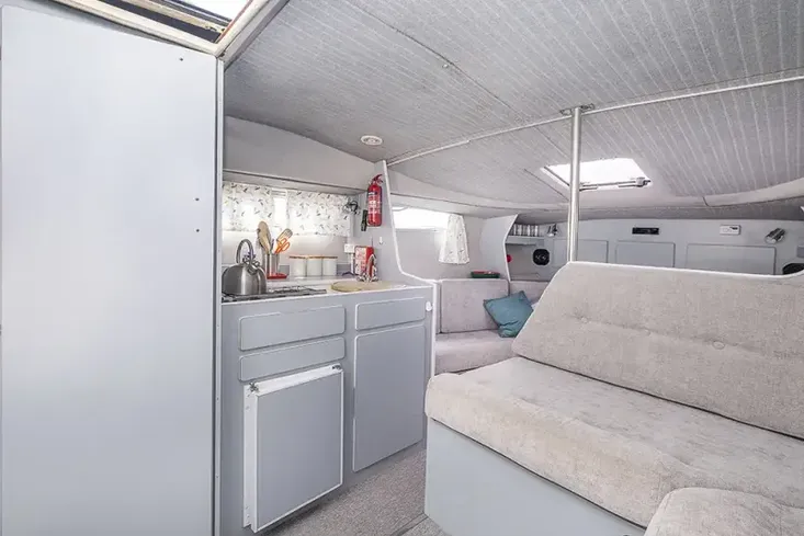 The galley is well-equipped with fridge, hob, and grill, and the head is well-maintained with shower, basin, and hot and cold water supply.